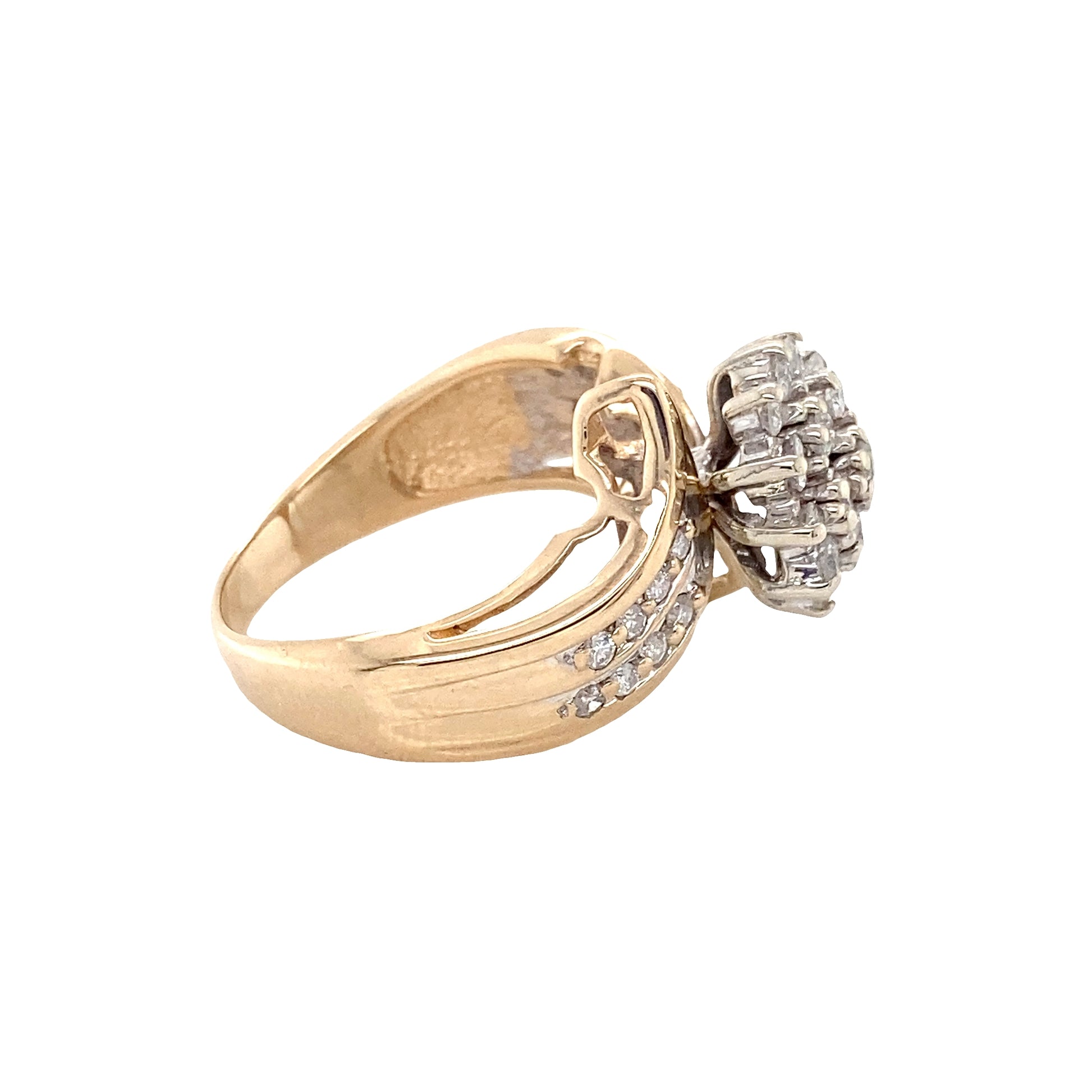 This exquisite 14ct Yellow Gold ring features a stunning diamond cluster centrepiece, enhanced by elegantly twisted shoulders adorned with sparkling diamonds. With approximately 1.10 carats of total Diamond weight, it offers timeless sophistication and brilliance, perfect for adding a refined touch to any ensemble.