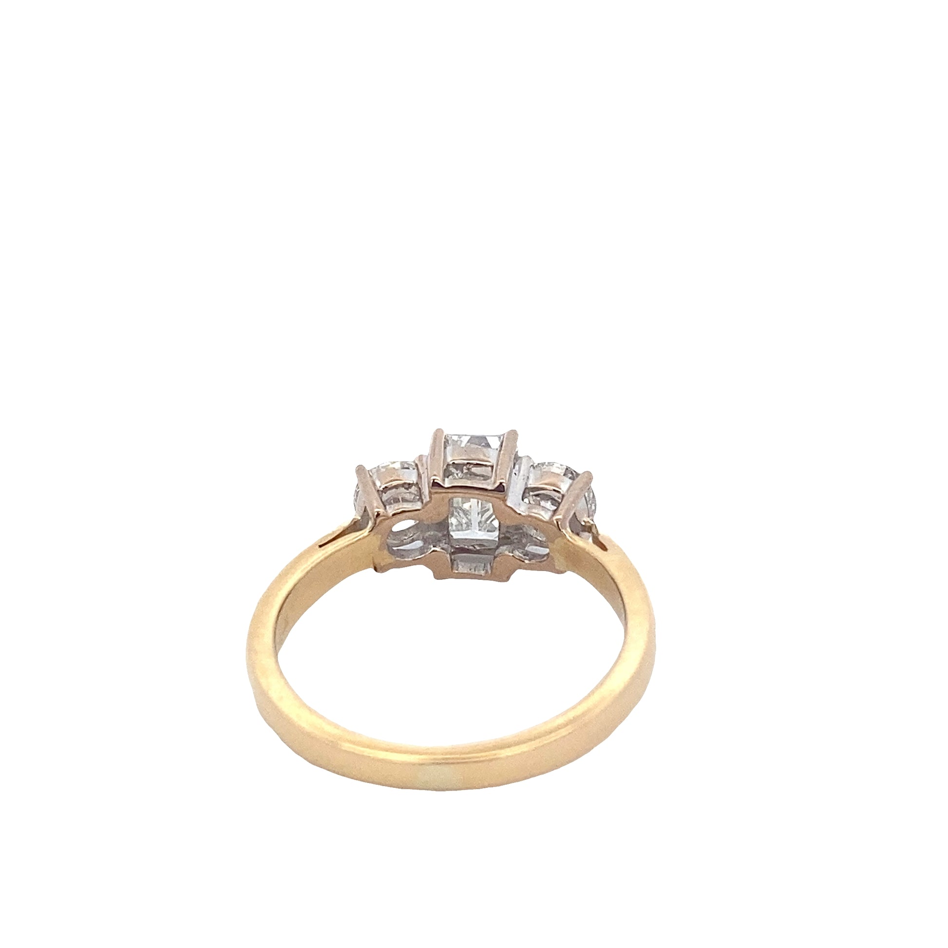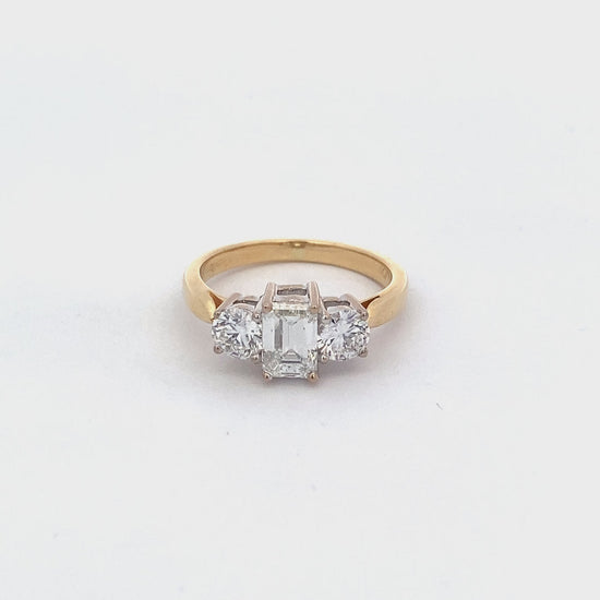 This elegant 18ct yellow gold ring features a stunning emerald centre diamond with two round brilliant cut diamonds each side, creating a timeless three-stone design. With a total carat weight of approximately 1.43cts and a centre stone of about 0.81cts, the diamonds are graded F/E colour and VS2 clarity, ensuring sparkle and quality.