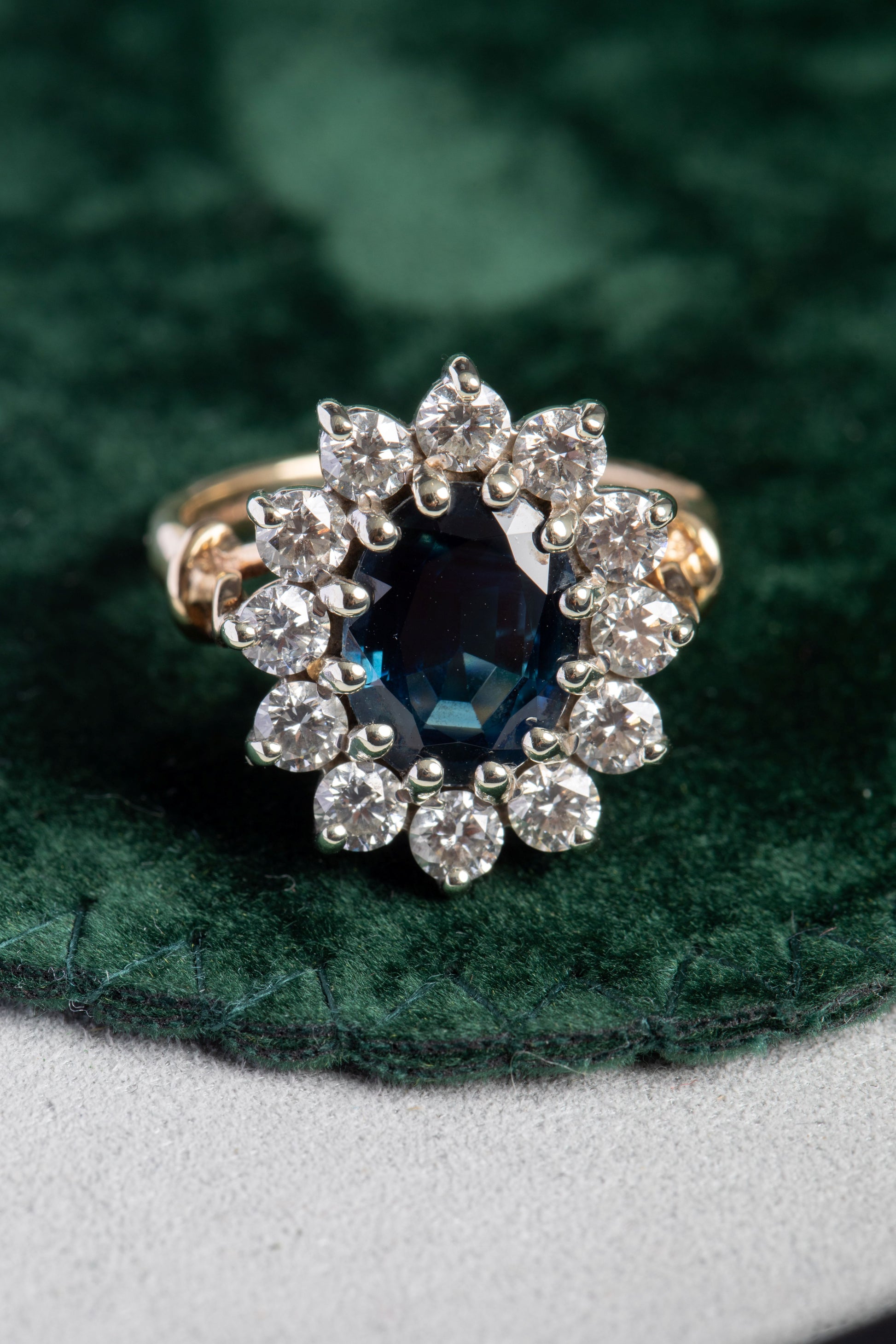 This 9ct Yellow Gold ring features a stunning 10 x 8mm oval shaped Sapphire, surrounded by 12 Round Brilliant Cut Diamonds totalling approximately 1.20 carats. Its elegant design combines rich colour with sparkling brilliance, creating a captivating piece that adds timeless sophistication to any ensemble.