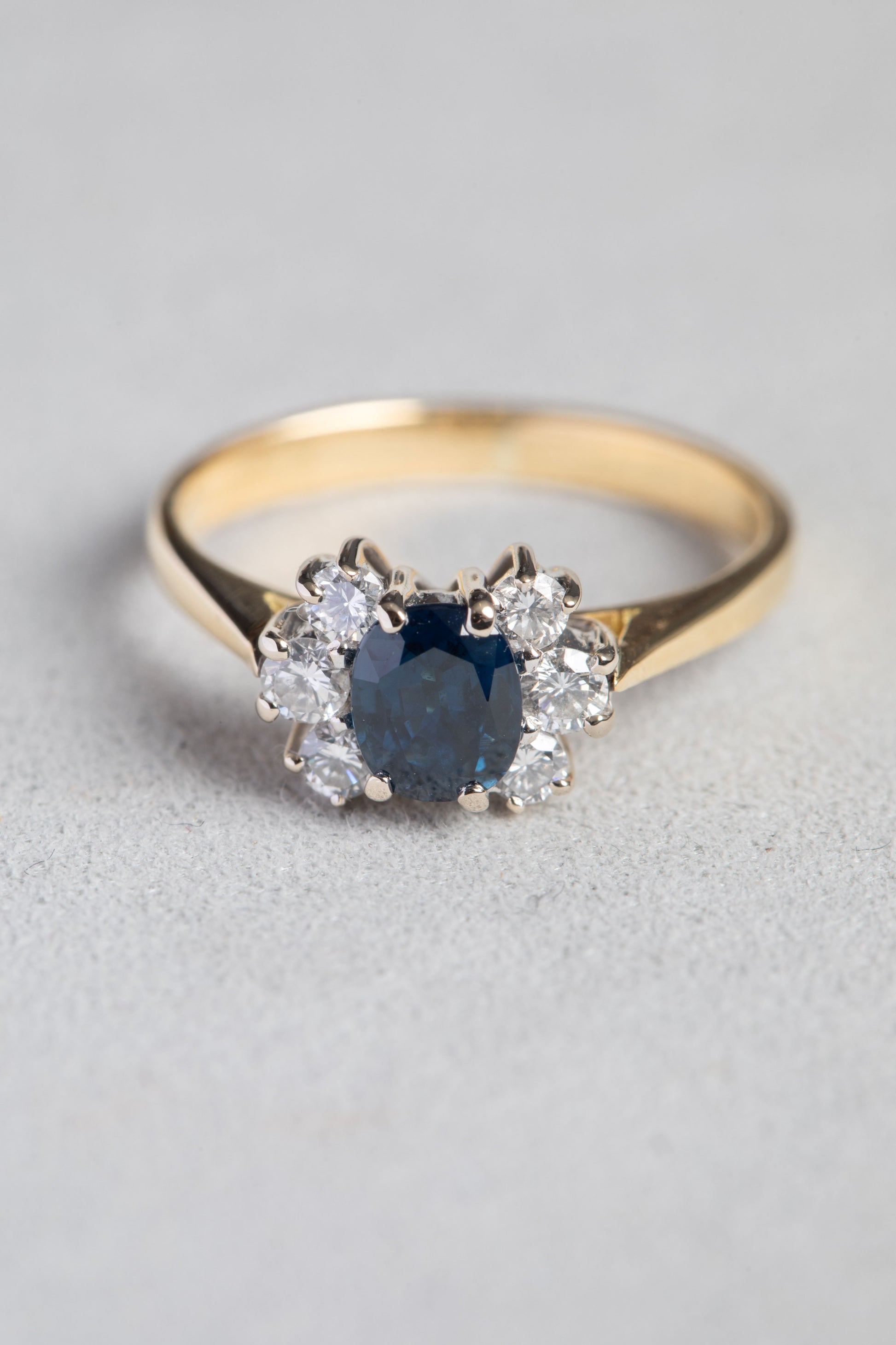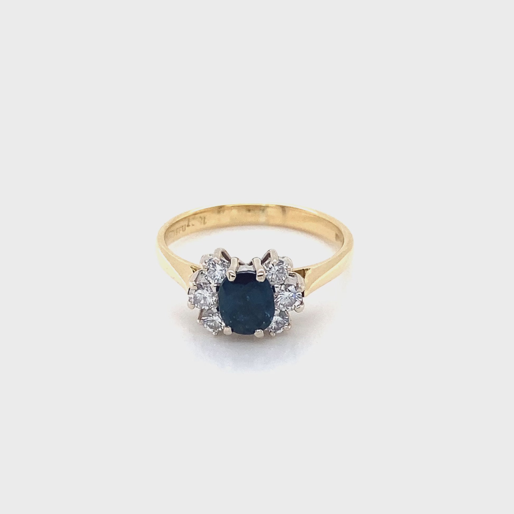 Crafted in 18ct Yellow Gold, this elegant ring features a 5.5 x 4.5mm oval shaped Sapphire at its centre, surrounded by six Round Brilliant Cut Diamonds totalling approximately 0.20cts. The design balances vivid colour with sparkling brilliance, making it a refined choice for sophisticated style and timeless elegance.