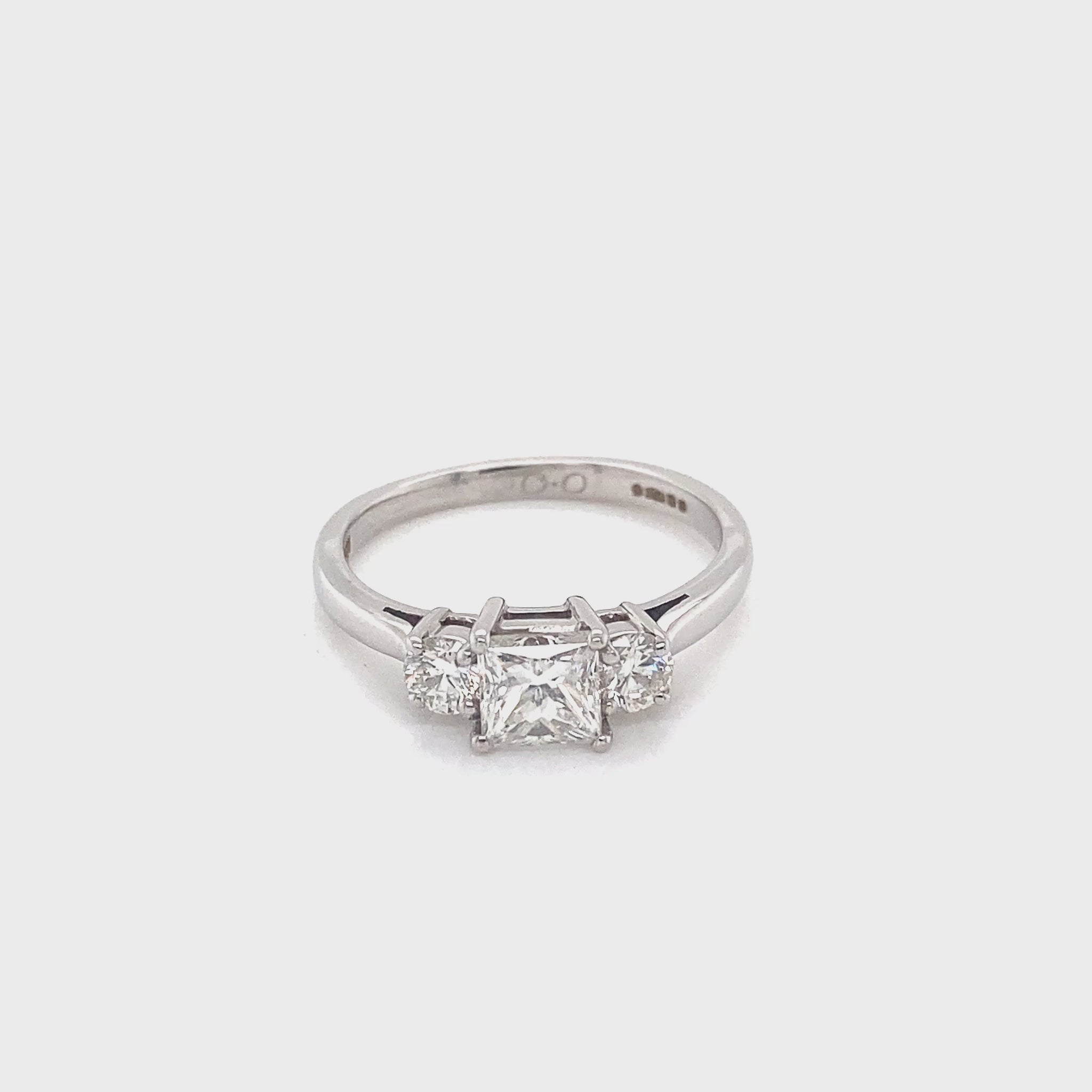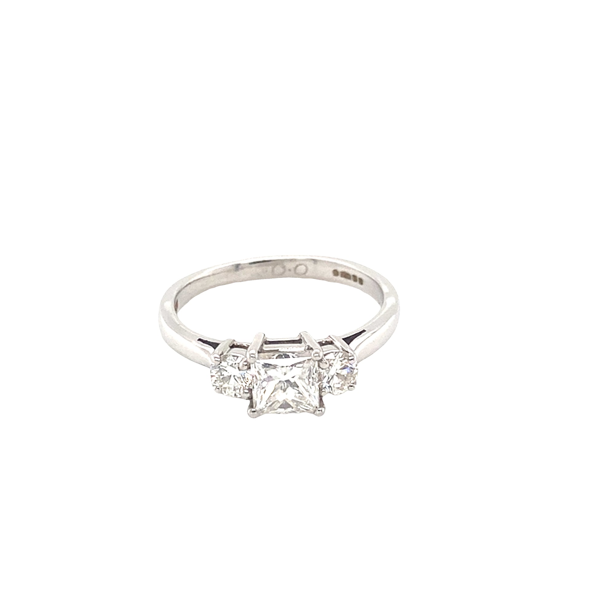 This elegant three-stone ring features a 0.53ct Princess Cut Diamond at its centre, flanked by two Round Brilliant Cut Diamonds of approximately 0.25cts each, for a total Diamond weight of approximately 1.03cts. Set in Platinum with a 2mm thickness shank, the G colour and SI1 clarity Diamonds combine to deliver refined brilliance and timeless sophistication.