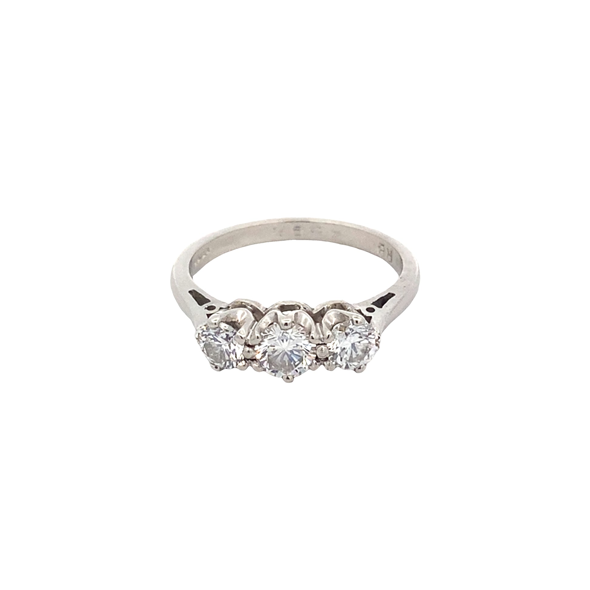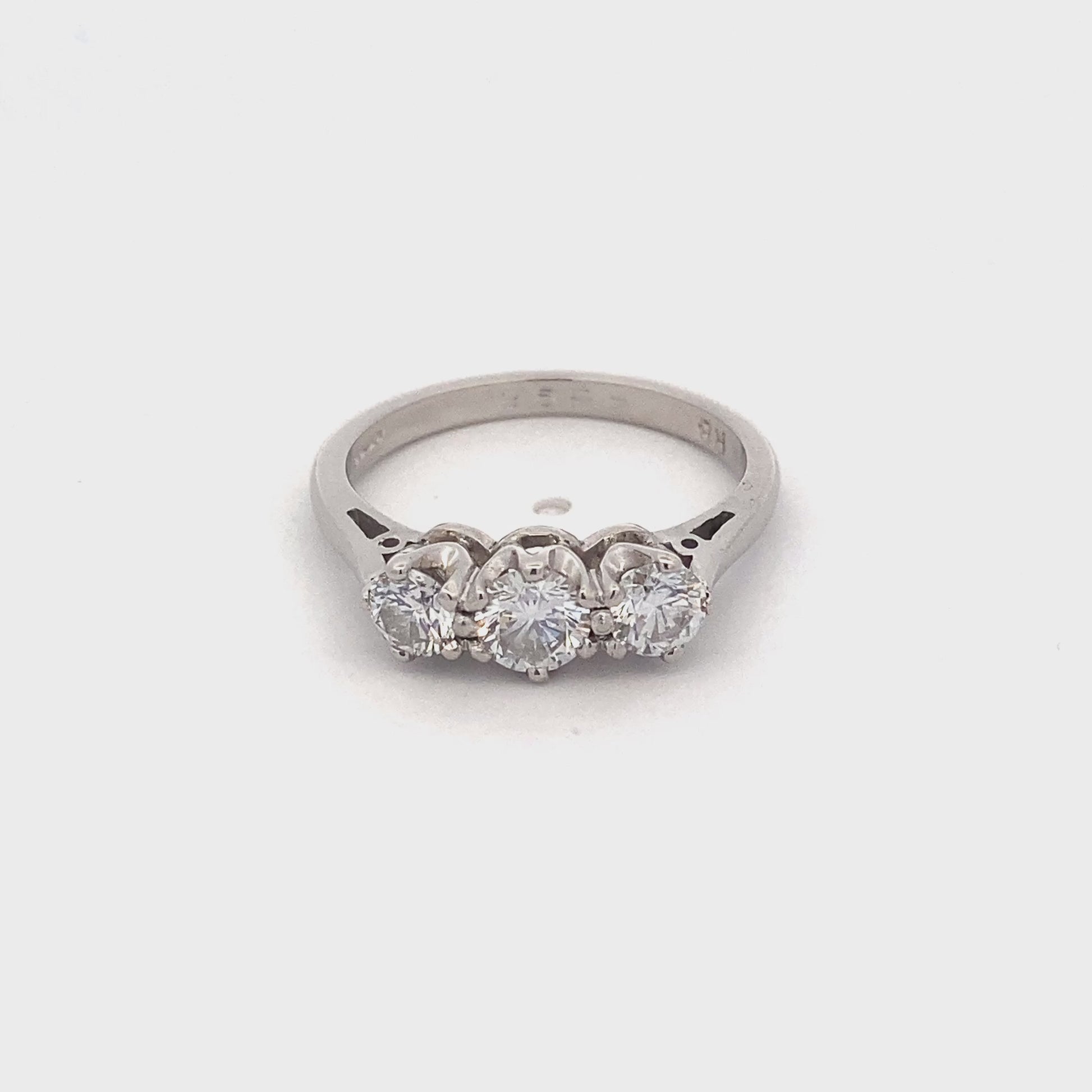 This exquisite three-stone diamond ring features Round Brilliant Cut Diamonds totalling approximately 0.70 carats, set in elegant Platinum. This timeless ring has F/E colour grade and VS2 clarity and each diamond offers exceptional sparkle.