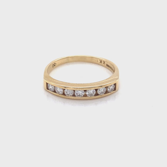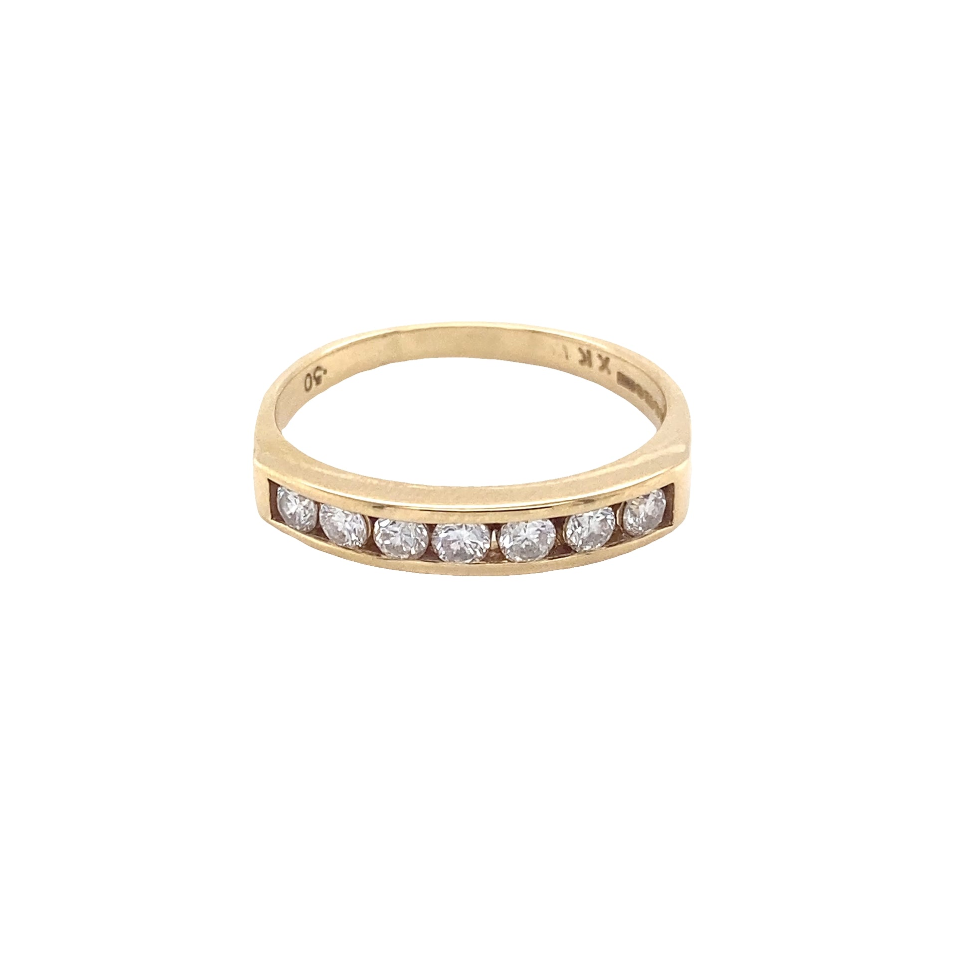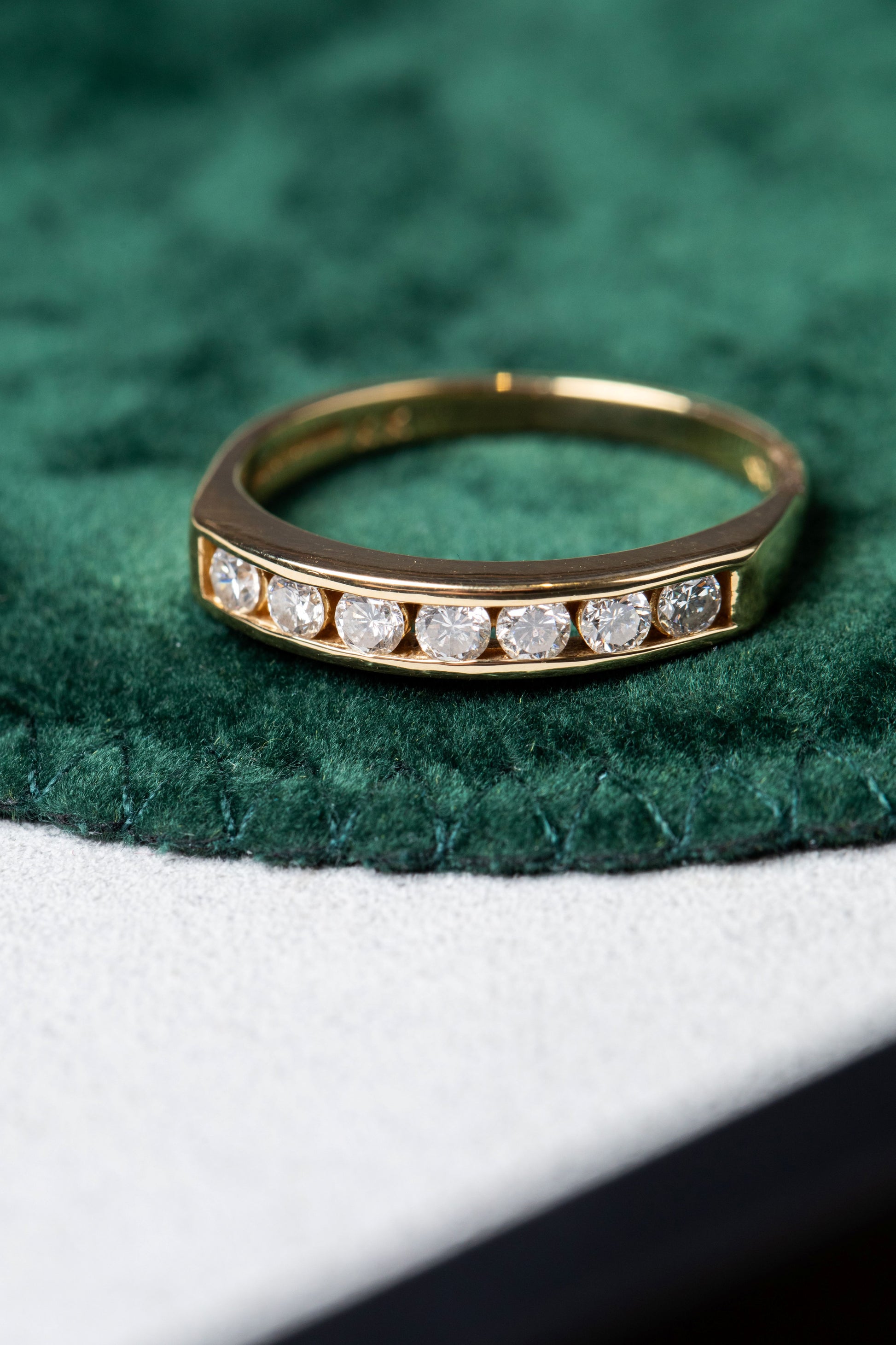 This elegant 18ct yellow gold eternity ring features seven round brilliant cut diamonds, channel set for a sleek, modern look. With a total diamond weight of approximately 0.50cts, it offers a perfect balance of sparkle and sophistication. This ring is an exquisite choice for adding timeless luxury to any collection.