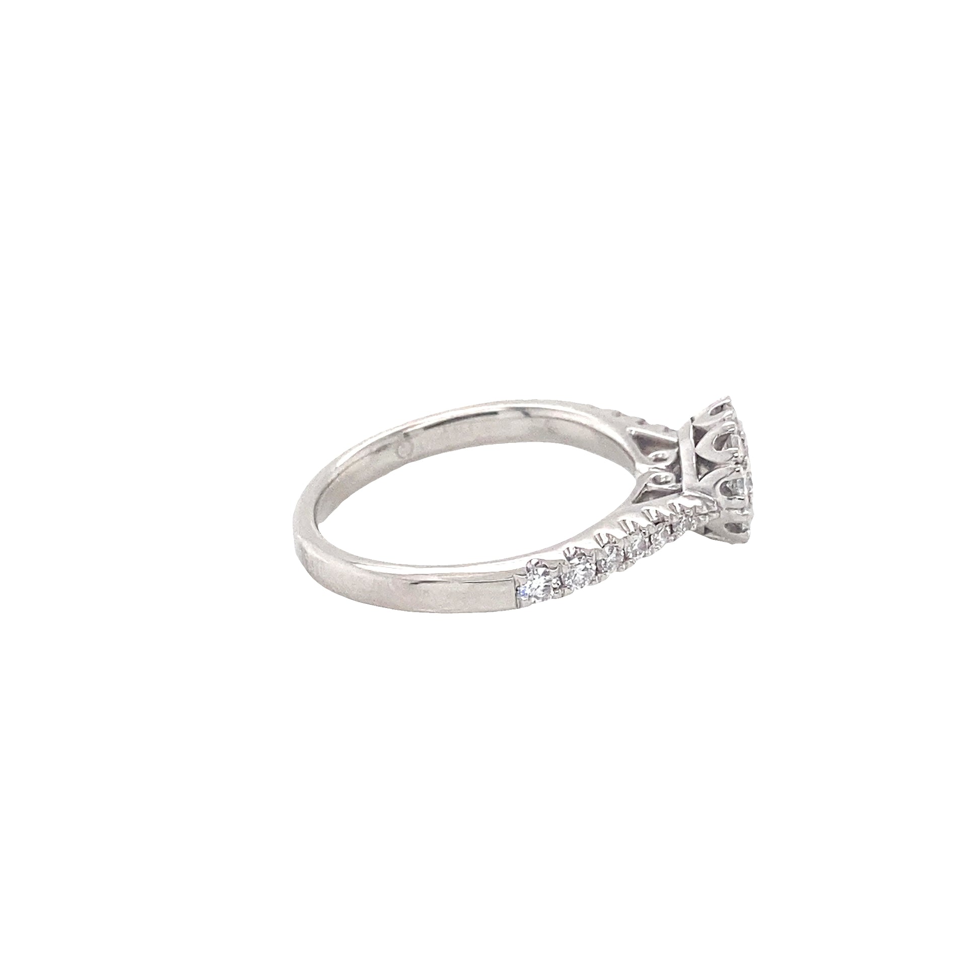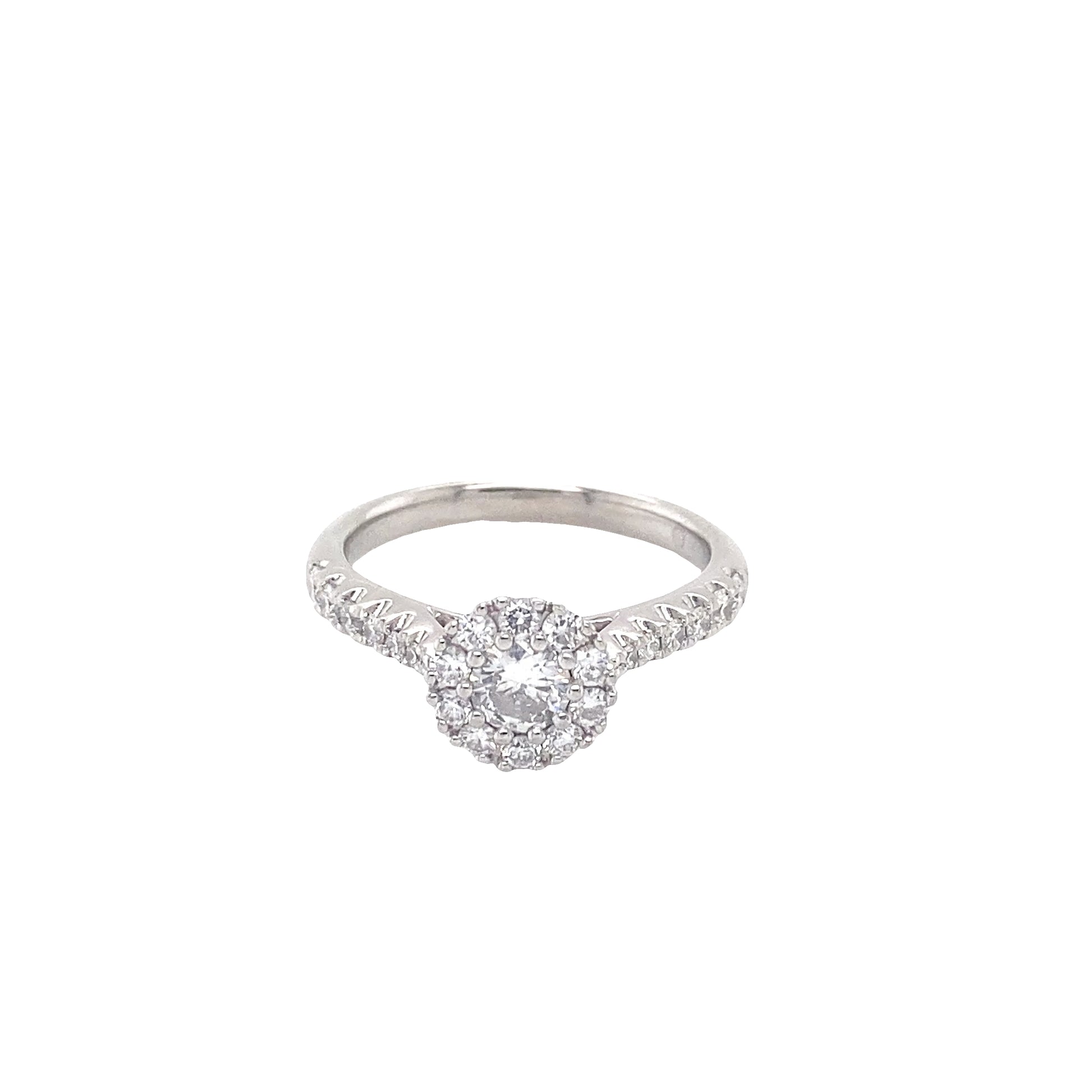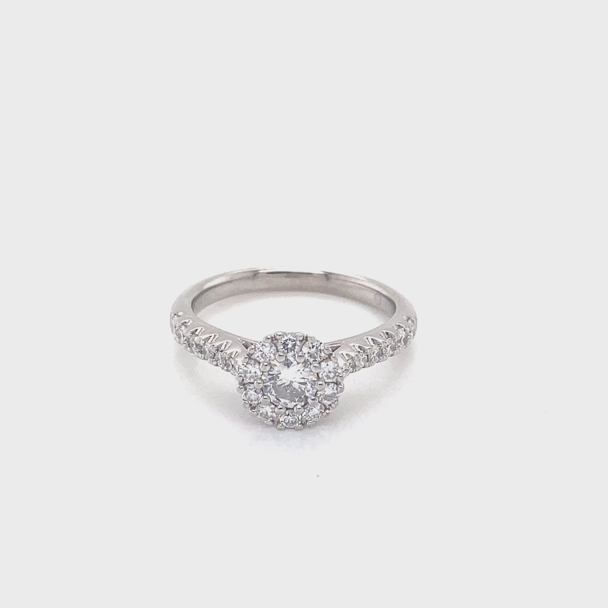Diamond Details: Round Brilliant Cut Diamond centre stone with Halo of Diamonds and Diamond set shoulders, colour - G, clarity - SI1 and total diamond weight - 0.51cts.