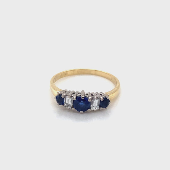 This exquisite suspected 18ct Yellow Gold ring features a captivating arrangement of three round Sapphires and two Emerald-Cut Diamonds, blending vibrant colour with refined brilliance. Designed to showcase the striking contrast between deep blue Sapphires and sparkling Diamonds, it offers timeless elegance and subtle luxury for any special occasion.
